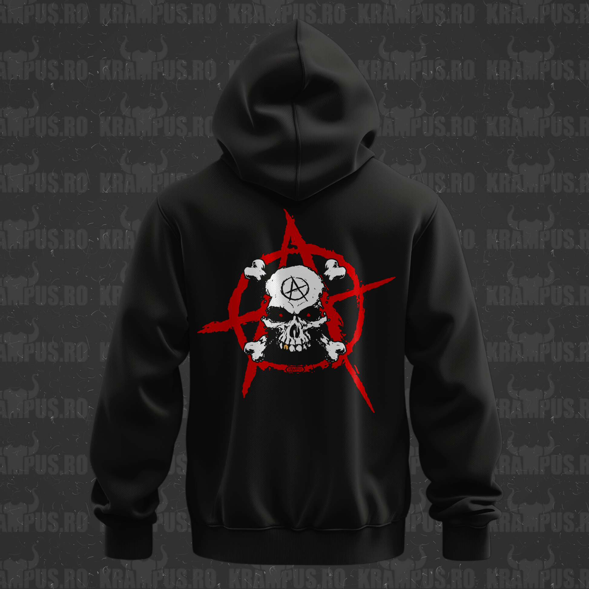 Un hanorac negru, confortabil și versatil, cu o notă unică de atitudine. Pe spate, printul unui craniu cu litera A reprezentata de anarhie.