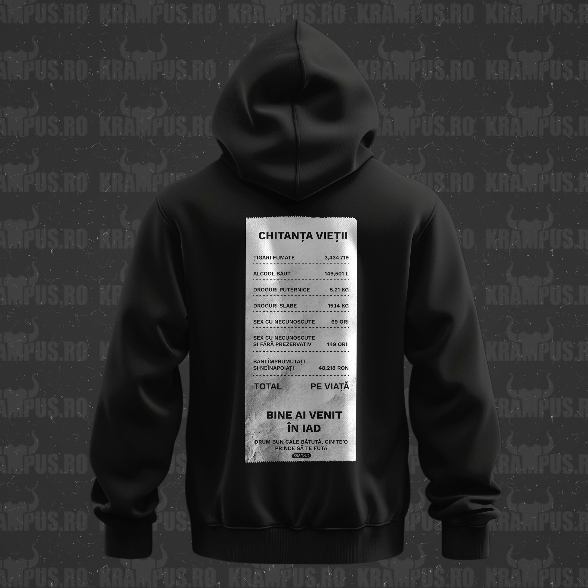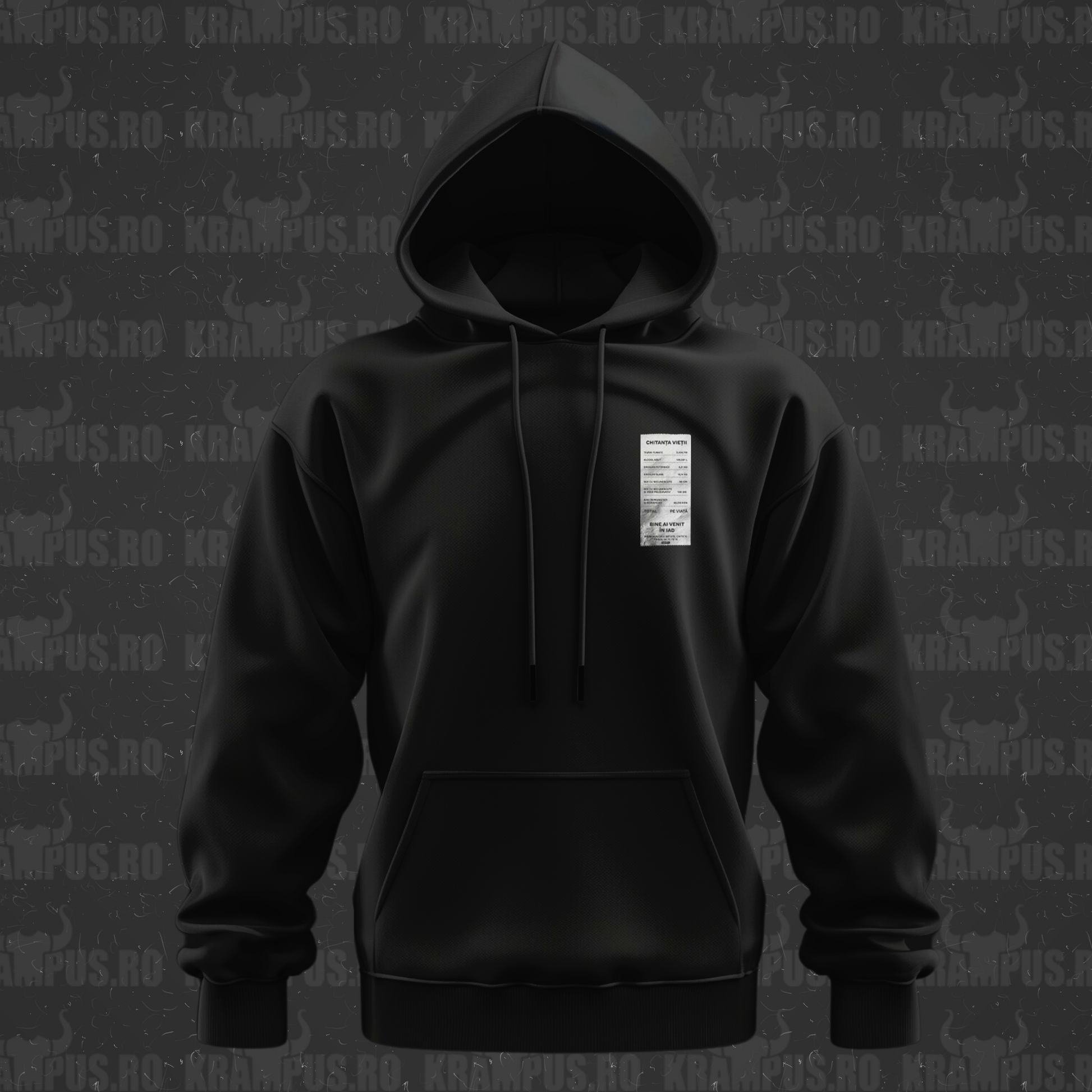 Un hanorac negru, confortabil și versatil, cu o notă unică de atitudine. Pe spate, un print îndrăzneț cu Chitanta Vietii ce transmite un mesaj puternic, perfect pentru cei care vor să își exprime trairile printr-o chitanta.